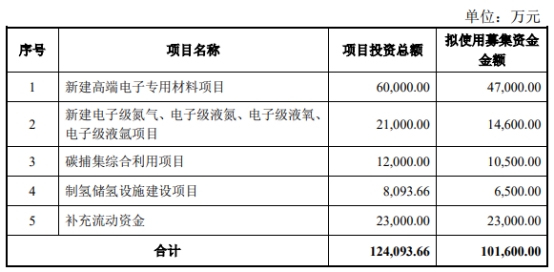 昨日晚间,金宏气体发布向不特定对象发行可转换公司债券预案,本次向不特定对象发行可转换公司债券的募集资金总额不超过101,600.00万元(含101,600.00万元),扣除发行费用后的募集资金净额将分别用于“新建高端电子专用材料项目”、“新建电子级氮气、电子级液氮、电子级液氧、电子级液氩项目”、“碳捕集综合利用项目”、“制氢储氢设施建设项目”、“补充流动资金”。