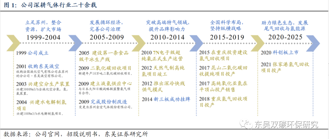深耕气体行业廿余载,国内气体行业领军企业。苏州金宏气体股份有限公司成立于1999年,是专业从事气体的研发、生产、销售和服务一体化解决方案的环保集约型气体综合供应商。1)2000年以大宗气体为基石开拓市场,收购法国液化空气有限公司在苏州的部分气体生产资产,以大宗气体业务为基石,逐步开拓市场;2)2005年迈入循环经济业务,兴建年产10万吨二氧化碳回收项目成功打通尾气回收利用业务模式。2009年公司完成股份制改造,治理体系日趋完善;3)2010年突破高端特气领域,7N电子级超纯氨正式生产运营, 2012年投资建设天然气制氢项目,2014年公司在新三板挂牌;4)2015年纵横发展布局全国市场,布局重庆建设氢气回收项目;2017年于河南平顶山投产销售高纯氧化亚氮;5)2020年发力氢能资源化领域,加大尾气资源回收项目投资,深度参与氢能产业链发展。同年公司在科创板上市(股票代码:688106)。