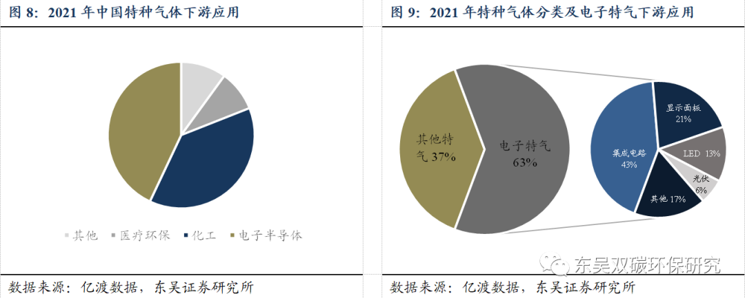 特种气体市场中电子特气占比超六成,半导体需求成为行业扩容关键。特种气体下游应用涉及电子半导体、化工、医疗环保等行业,2021年各行业占比分别为43%、38%和9%。根据亿渡数据统计,2021年在特种气体的细分赛道中,电子特气的市场规模占比达到特种气体市场总规模63%。电子气体被称为集成电路、液晶面板、LED及光伏等材料的“粮食”和“源”。被广泛引用于电子产品制程工艺中的离子注入、刻蚀、气相沉积、掺杂等。2020年我国电子特气国产化率仅15%,自主可控迫在眉睫,本土企业有望加速发展。在国家政策持续推动以及电子半导体下游需求高速增加的带动下,电子特气市场空间有望进一步扩容。