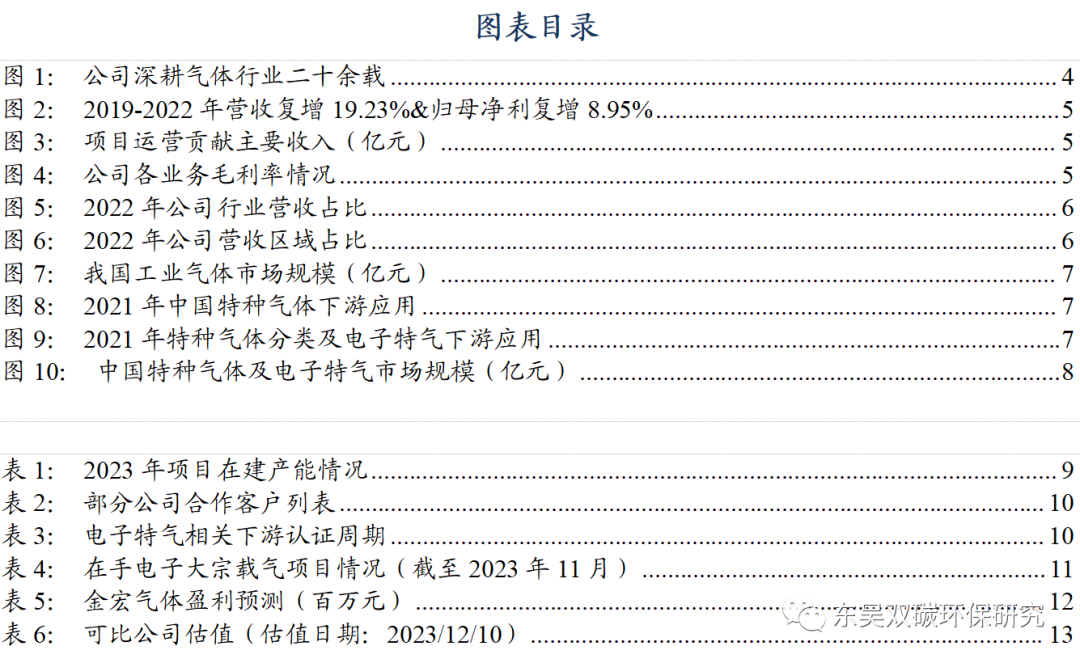 | 综合性气体供应商龙头,大宗气体特种气体并驾齐驱。公司成立于1999年,以大宗气体为基石开拓市场,2010年突破高端特气领域正式生产运营7N电子级超纯氨。公司深耕气体行业廿余载,现已成为拥有大宗气体、特种气体、燃气的综合型气体供应商,业务模式多元涵盖现场制气及槽罐供气、钢瓶供气的零售供气。业务种类不断突破涉及电子大宗、TGCM等。公司下游客户广泛,不仅包括冶金、化工等传统行业的客户,还覆盖集成电路、光伏、医疗健康等新兴行业客户。工业气体赛道景气度明朗,下游迎扩产热潮电子特气加速发展。1)工业气体赛道景气度明朗,下游领域不断拓宽,我们预计2030年我国工业气体市场规模有望超4392亿元,长坡厚雪。2)半导体需求热潮成为行业扩容关键,国产化率较低自主可控迫在眉睫。特气下游超四成应用于电子半导体领域,2022年气体占晶圆制造材料成本13%为第二大耗材。下游需求增长助特气市场空间扩容。我们预计2030年我国特种/电子特气市场规模有望达1941/1436亿元。2020年我国电子特气国产化率仅15%,自主可控迫在眉睫,本土企业有望加速发展。大宗气体业务推进一体化战略,向上增加原材料自给产能,向下拓宽销售渠道。公司积极自建空分项目,苏相金宏润空分项目于 6 月成功封顶,投产后将提高公司液氧、液氮的自给比率。公司坚持横向扩张战略,核心区域不断增加零售网点,截至2023年8月,公司在长三角核心区域收购上海振志、上海畅和、上海医阳三家医用氧销售公司,进一步整合上海区域的医用氧销售渠道。太仓金宏充装站项目正在产业化推进过程中,启东金宏、如皋金宏两个新建项目正在申请备案等合规手续中。公司的市场占有率,巩固公司的行业地位。产能迎释放高峰,业绩步入高增速时代。1)公司特气品类不断完善,客户突破已显成效。公司拳头产品超纯氨、高纯氧化亚氮等产品已供应中芯国际、海力士、镁光、联芯集成等知名半导体客户。投产新品高纯二氧化碳已实现小批量供应,正硅酸乙酯已在联芯、苏州和舰等公司进行大批量测试;在建新品全氟丁二烯、一氟甲烷、八氟环丁烷、二氯二氢硅、六氯乙硅烷、乙硅烷、三甲基硅胺等 7 款产品正在产业化过程中。2)电子大宗载气积极推进,截至 2023 年9 月,公司已签订 7个电子大宗载气项目订单:广东芯粤能项目、西安卫光项目已量产供气;北方集成创新中心项目在建中并处于临时供气状态;广东光大项目、厦门天马项目、无锡华润上华项目、苏州龙驰项目尚未正式供气,营收弹性可观。盈利预测与投资评级:综合性气体供应商龙头,大宗气体特种气体并驾齐驱。预计公司2023-2025年归母净利润为3.20/4.10/5.28亿元,同增40%/28%/29%,对应36/28/22倍PE,关注公司内生外延带动的业绩增长及半导体材料等下游国产替代逻辑,首次覆盖,给予“买入”评级。风险提示:下游需求不及预期、项目研发不及预期、市场价格波动风险。 |