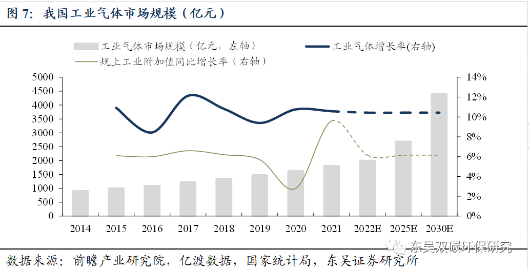 受益于中国经济的不断发展,2030年工业气体市场规模有望达4392亿元。由于工业气体被广泛应用在工业制造的各个领域,所以其市场规模的增速与工业产值的增速有明显的相关性。根据国家统计局披露,2015-2021年我国规模以上(规上)工业附加值的年均增速为6.14%。根据亿渡数据和前瞻产业研究院统计,2021年我国工业气体市场规模达1798亿元,2015-2021年均增速为10.43%,是规上工业附加值年均增速的1.70倍,体现出了超过平均水平的增速。假设“十四五”期间我国规上工业附加值以6.14%稳步增长,按工业气体为规上工业附加值年均增速1.70倍测算,2025/2030年我国工业气体市场规模有望达2674/4392亿元。