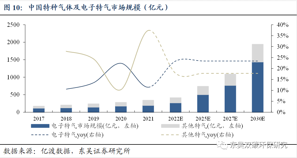 受下游需求带动,2030年我国特种气体市场规模约1941亿元,电子特气市场规模达1436亿元。受益于下游产业的蓬勃发展,中国特种气体行业市场规模不断扩大,根据亿渡数据统计,17年我国特种气体市场规模约为175亿元,2021年市场规模已突破342亿元,与2020年相比同增21.28%,4年复增高达18.24%。电子气体市场规模呈高速上升趋势,21年规模达216亿元,同增23.43%。我们保守假设2022-2030年特种气体增速按21.28%,电子特气增速按23.43%进行测算,2022/2025/2030年我国特种气体市场规模可达415/740/1941亿元,其中电子特气市场规模为267/501/1436亿元,2030年占比将达74%。