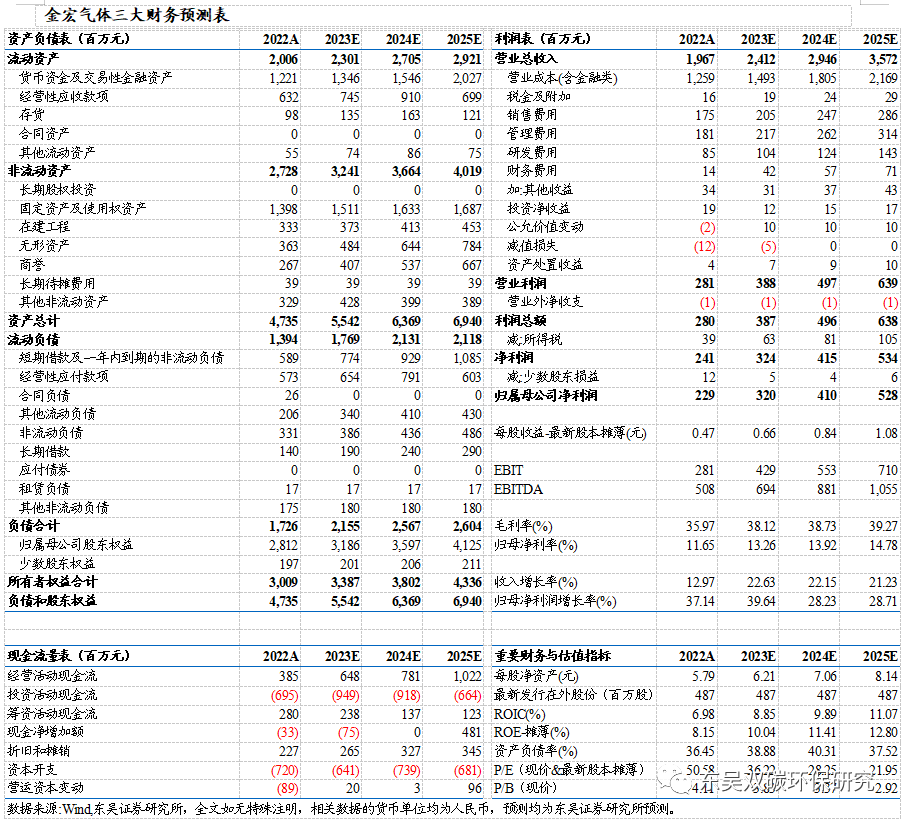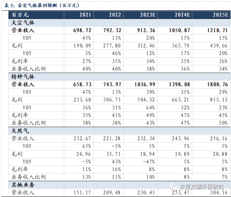 2)特种气体业务:在国产替代政策强力支持、下游行业积极扩产需求、公司加快推进新品研发及产能释放的多重驱动下,未来特种气体业务规模将不断扩大。眉山金宏项目规划新建10000吨超纯氨及副产品和一期2000万Nm3氢气,于2023年6月开启试生产,伴随产能释放即将贡献营收。苏州85亩地项目二期/三期、全椒金宏项目包含7款电子级特气产品,计划于2023年12月开始试生产预计于2024年陆续增厚营收。经测算,我们预计2023-2025年特种气体业务营业收入增速分别为39%、35%和29%,2023年-2025年特种气体业务毛利率为49%、47%和45%。