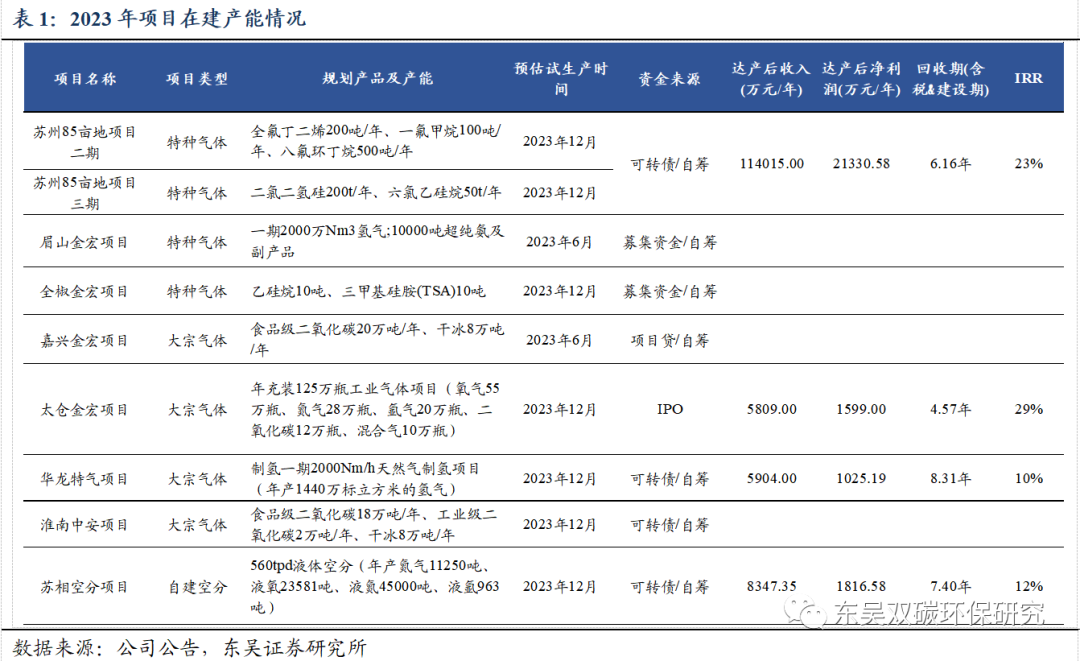 新产能释放新产品上市,业绩增长空间可期。2023年公司在特种气体产业化、碳捕集利用、氢气生产、空分生产和电子大宗载气项目建设等多方面进行布局。在特气业务方面,公司有苏州85亩地项目二期/三期(新建高端电子专用材料项目)、眉山金宏项目、全椒金宏项目等多个项目在建待投产,核心产品超纯氨将新增1万吨产能,全氟丁二烯、一氟甲烷、八氟环丁烷、二氯二氢硅、六氯乙硅烷、乙硅烷及三甲基硅胺等7款电子级特气产品将实现产业化。在大宗气体业务方面,公司有嘉兴金宏项目、太仓金宏项目、苏相空分项目、淮南中安项目等项目在建待投产,建成后氮氧氩产能大幅提升,部分原料气可实现自给,二氧化碳产能将新增40万吨/年。2023年基于各产品投产节奏,公司未来营收增长将主要来自于超纯氨、氢气、二氧化碳等新增产能的释放,高纯二氧化碳、硅烷、氦气等新增产品的导入,以及电子大宗载气项目的正式供气,增长空间可期。