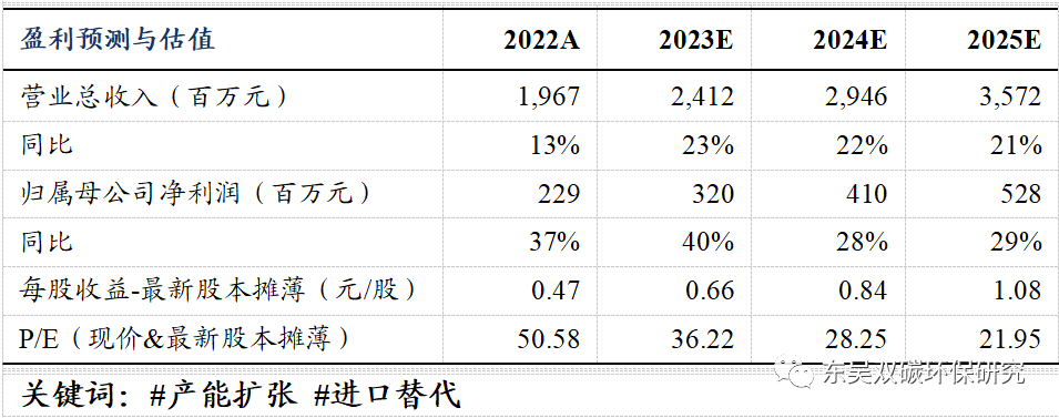 随着公司大宗气体和特种气体产能规模持续扩大,关注公司内生外延所致的业绩增长以及半导体材料等下游国产替代逻辑,我们预计 2023-2025 年公司营业收入分别为24.12/29.46/35.72亿元,同比增长23%/22%/21%,毛利率为38%/39%/39%。其中: