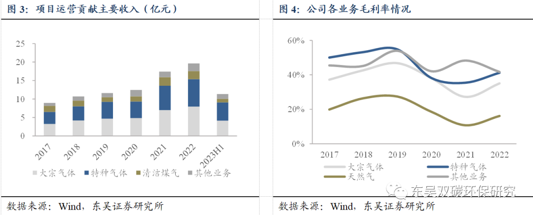 特种气体为高技术壁垒高附加值产品,带动公司整体毛利率水平。2022年特种气体毛利率达41.23%,作为高技术壁垒及高附加值产品连续多年维持在高毛利水平,拉动公司整体毛利率;2021年在大宗商品涨价压力持续传导的背景下,大宗气体毛利率从2020年的38.1%下滑至27.2%,天然气毛利率从2020年的18.6%下滑至10.7%。伴随公司新空分项目逐步投产,大宗商品价格回稳,2022年大宗气体毛利率回升至35.06%,天然气毛利率回升至16.14%。