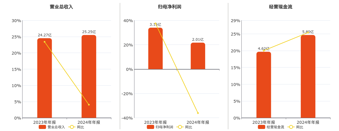 公司营业总收入为25.25亿元。归母净利润为2.01亿元,较去年同报告期归母净利润减少1.14亿元,同比较去年同期下降36.12%。经营活动现金净流入为5.80亿元。
