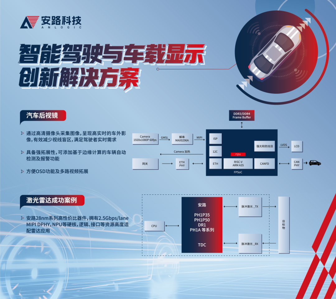 随着汽车向智能化、电动化和网联化深入发展,当前汽车电子后视镜正在迅速发展,成为众多车型的必选或选配方案。展会现场, 安路科技 重点展示了针对汽车后视镜、激光雷达等领域的定制化FPGA解决方案。