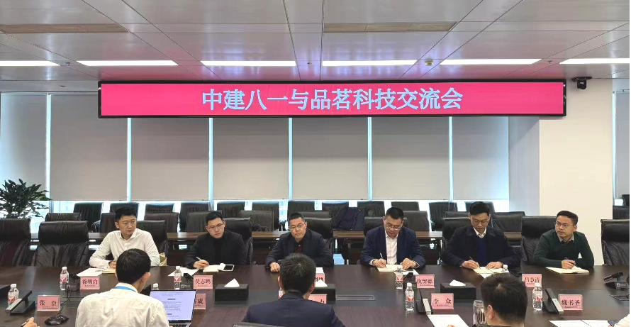 中建八局一公司工程研究院、科技部、质量部、信息化部相关领导,品茗科技董事莫志鹏,山东品茗信息科技有限公司董事长仇留德及相关人员参加座谈。