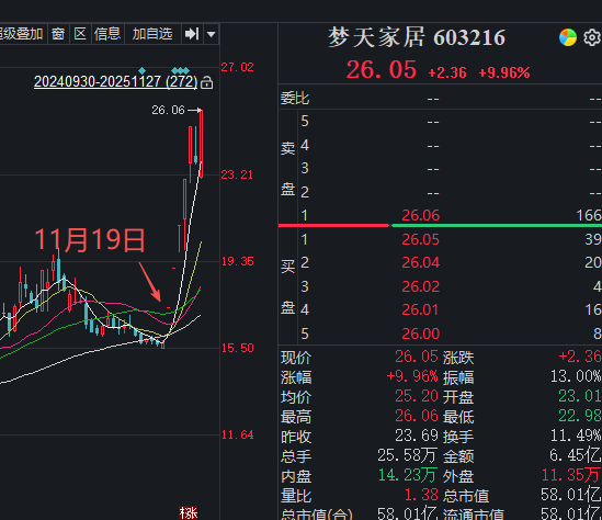 同样是宣布控制权转让终止的同时,披露股权向具有科技行业的交易对手方转让的消息, 梦天家居 复牌后也拿下连板,11月19日至今涨幅达65.92%。
