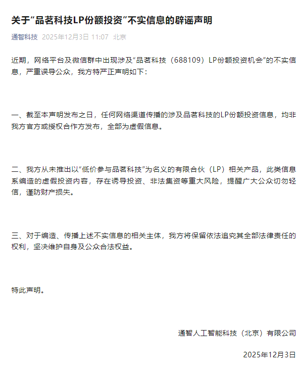 12月3日,通智科技严正声明,称从未推出以“低价参与 品茗科技 ”为名义的有限合伙(LP)相关产品,此类信息系编造的虚假投资内容,存在诱导投资、非法集资等重大风险,提醒广大公众切勿轻信,谨防财产损失。通智科技强调,截至本声明发布之日,任何网络渠道传播的涉及 品茗科技 的LP份额投资信息,均非通智科技官方或授权合作方发布,全部为虚假信息。