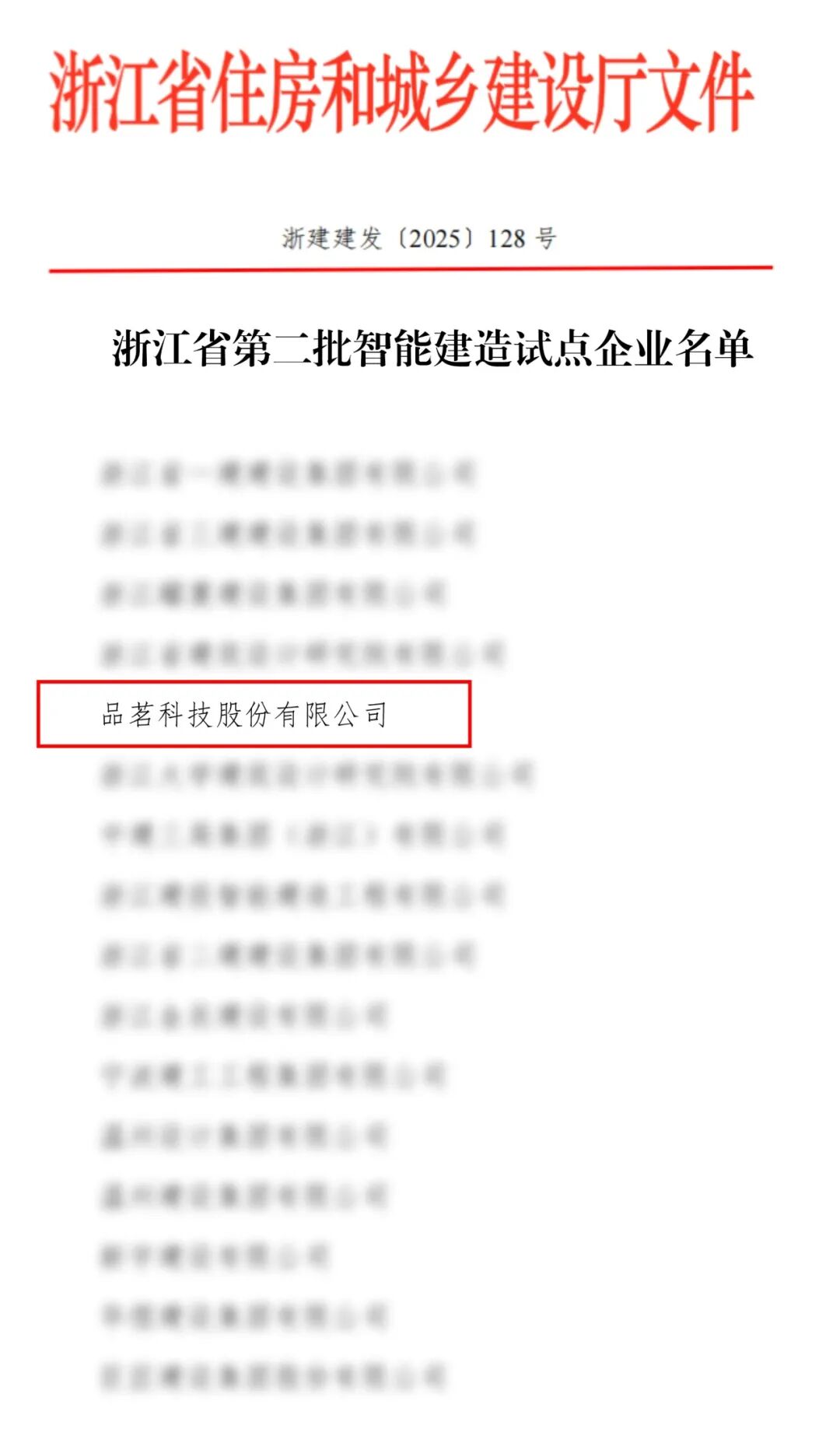 近日, 浙江省住房和城乡建设厅 正式公布《浙江省第二批智能建造试点企业名单》, 品茗科技 凭借在建筑业数字化领域的技术积累与实践成果,成功入选该名单,成为本次唯一上榜的科技企业。
