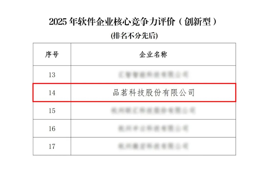 近日,2025年浙江省软件企业核心竞争力评价结果正式公布, 品茗科技 凭借突出的创新能力和扎实的技术积累,再次获评“浙江省软件企业核心竞争力企业(创新型)”,实现自2023年起连续三年蝉联该称号,“软”实力获行业认可。