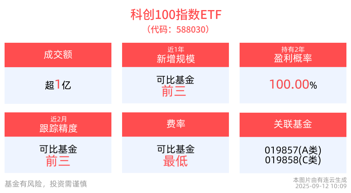 流动性方面,科创100指数ETF盘中换手2.56%,成交1.47亿元。拉长时间看,截至9月11日,科创100指数ETF近1年日均成交4.36亿元,居可比基金第一。
