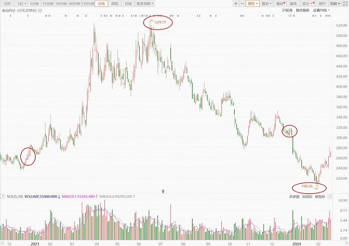 2023年1月3日,金山办公股票以263.46元/股(前复权股价,不复权为264.19元/股)开盘,到6月20日涨至最高点529.77元/股(前复权股价,不复权为530.50元/股),涨幅达101%。然而,下半年几乎跌回原形,到2023年12月29日金山办公股票收盘价为316.20元/股,相比于最高点已经下跌了40.31%。2024年2月5日,金山办公股价跌出近年最低点198.50元/股。
