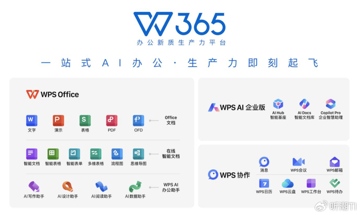 WPS 365走的正是这条路径。2024年4月9日,金山办公正式发布了WPS 365这一面向组织和企业的一站式AI办公平台。同时发布了面向企业端的“WPS AI”和“WPS协作”,后者包含消息、视频会议、邮件、日历等工具。