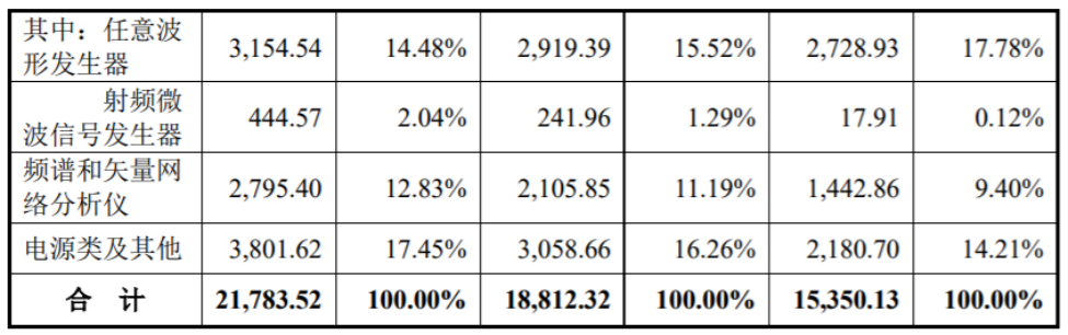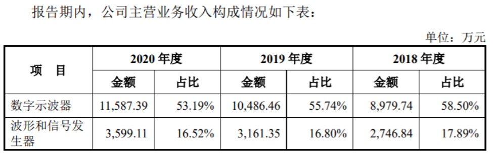 从主营业务上看,鼎阳科技主营业务收入主要由数字示波器、波形和信号发生器、频谱和矢量网络分析仪三类产品构成,该三类产品合计占主营业务收入的比例分别为85.79%、83.74%、82.55%和82.37%。