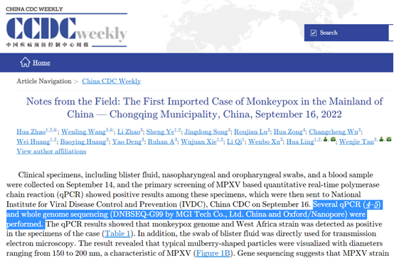 9月16日,采集的该男子的临床样本被送往中国疾病预防控制中心,进行了qPCR检测,并基于国投创益投资企业华大智造最新款基因测序仪DNBSEQ-G99等设备完成了全基因组测序。基因测序结果表明,该男子所感染的猴痘病毒(China-CQ202209)属于西非株的B.1分枝,和重庆疾控中心测序结果高度一致,并且与2022年6月21日在德国发现的毒株(GISAID ID: EPI_ISL_13889435)高度同源。这些结果确认了该病例为中国内地首例输入性猴痘病例。