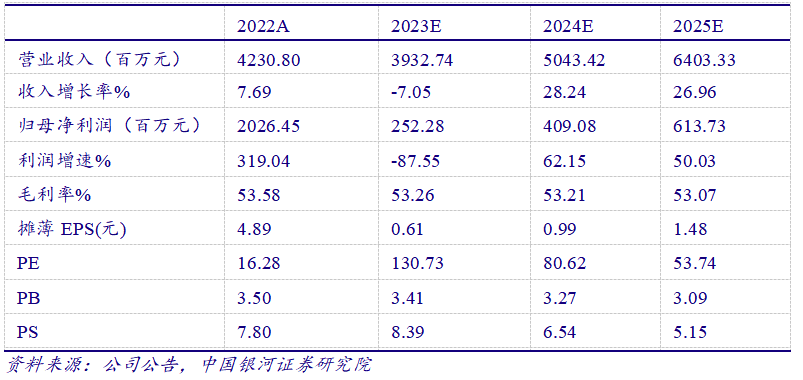 公司是技术立身、放眼全球的国产测序仪龙头,以核心技术和强产品力筑就极高竞争壁垒,随着海外经营环境愈发改善,全球市场空间有望进一步打开。我们预计公司2023-2025年归母净利润分别为2.52/4.09/6.14亿元,同比-87.55%/62.15%/50.03%,EPS分别0.61元、0.99元、1.48元,当前股价对应2023-2025年PE 131/81/54倍,首次给予“推荐”评级。