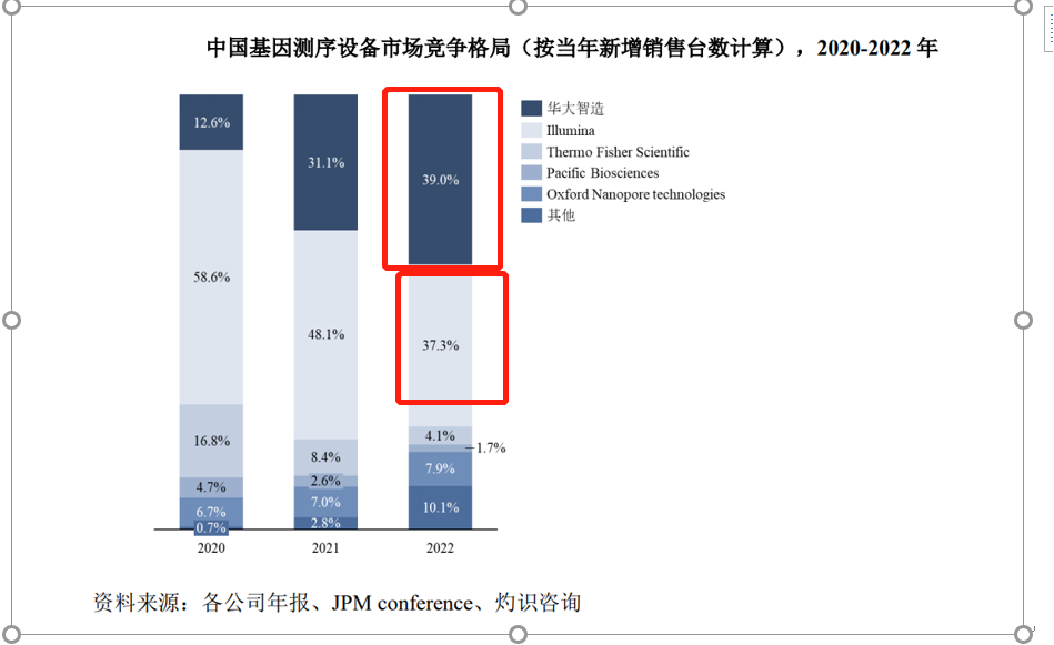值得注意的是,因美纳的颓势在很大程度上来自中国市场格局的微妙变化:2022年华大智造在国内基因测序设备市场份额对因美纳实现了反超(39%:37.3%)。