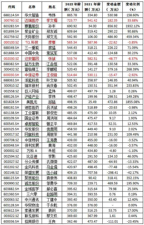 值得一提的是华大智造2022年9月才在科创板上市,从公司招股书看,韦炜2021年薪酬是334.8万元,这意味着其2022年薪酬同比大涨了158.60%,但不知2022年薪酬中是否包含有上市奖励。