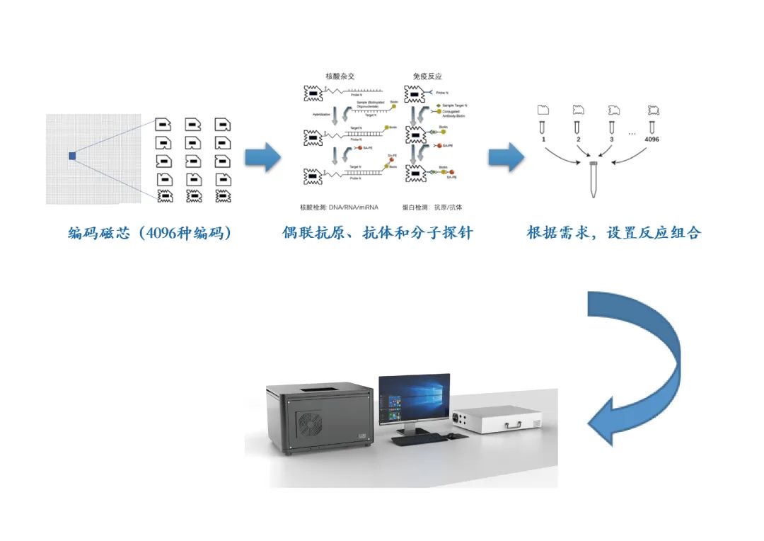 新型“编码磁珠多重联检技术平台”采用的液态芯片是利用电子芯片制造领域的合成材料复合技术、光刻技术、以及高分子表面修饰技术制造而成,可偶联抗原、抗体和分子探针,通过高速数字信号处理,多指标并行分析,可一孔(管)同时对待测标志物进行定量或定性分析,对多种不同的生物分子均具有高通量、高灵敏度、并行检测等特点;可用于免疫分析、核酸研究、酶学分析、受体、配体识别等多方面、多领域的研究。