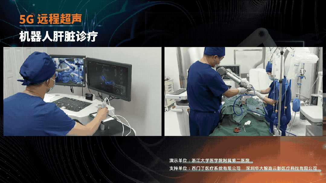 5G+超声,将为远程医疗带来怎样1+1 2的想象?在“5G造影·云介入”现场,来自浙江大学医学院附属第二医院的专家,实时连线医联体下级医院,展示了5G远程超声机器人肝脏诊疗。