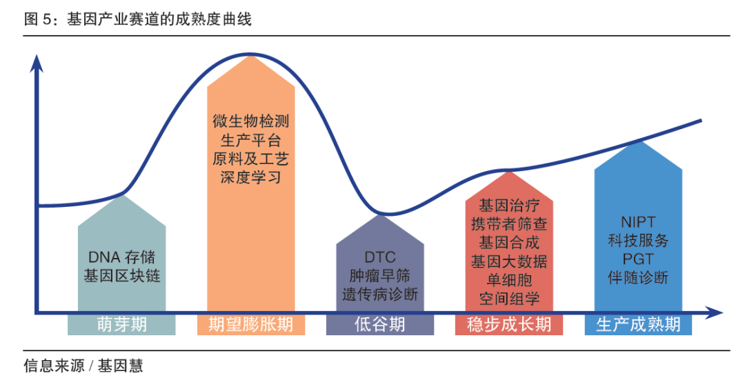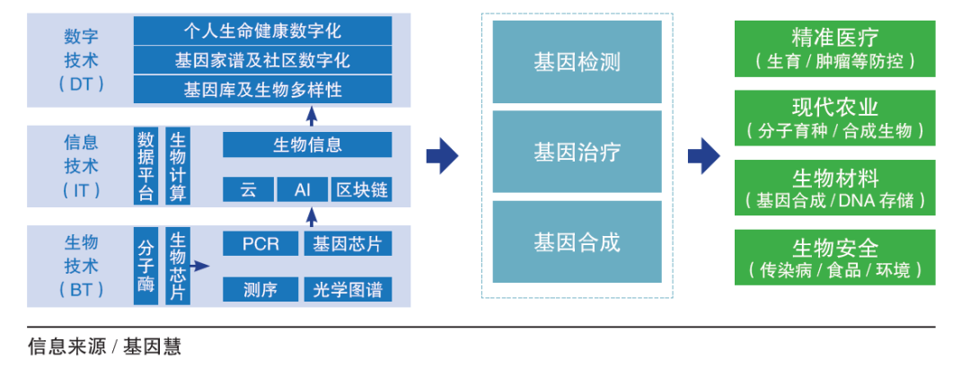 基因行业以基因大数据为纽带,将生物技术(BT)、信息技术(IT)以及数字技术(DT)结合,逐步实现生命健康数字化。聚焦中国基因产业图谱,基因行业已逐渐从技术驱动转移到应用驱动,主要聚焦医疗健康(生育、肿瘤、罕见病、传染病防控、生物医药等)以及农业(生物育种)和工业(合成生物)。直接的要素是市场准入和成本优化,本质要素是推动市场教育和挖掘应用场景。