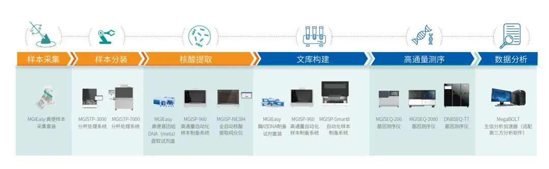 在支持MMHP项目推进的过程中,针对粪便样本的宏基因组测序工作全流程,华大智造提供了一整套经过验证的、一站式工具箱,助力微生物宏基因组研究。该工具箱涵盖了研究人员从粪便样本采集、菌群gDNA提取、文库构建到高通量测序及下机数据处理的全流程自动化所需配备的多款仪器设备和试剂耗材,同时搭配了ZLIMS实验室数据管理系统,不仅能够节省人工、快速满足中高通量的检测需求,而且自动化实验结果的可重复性高,更利于进行宏基因组组别间的分析。