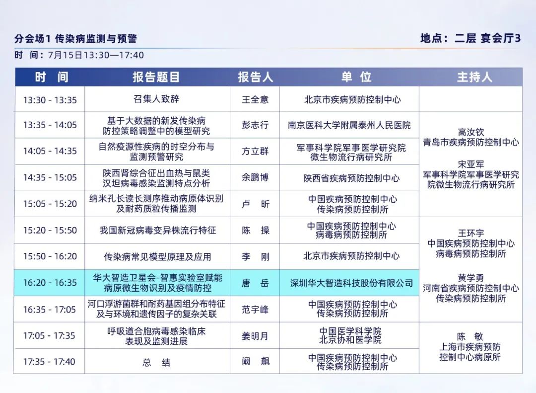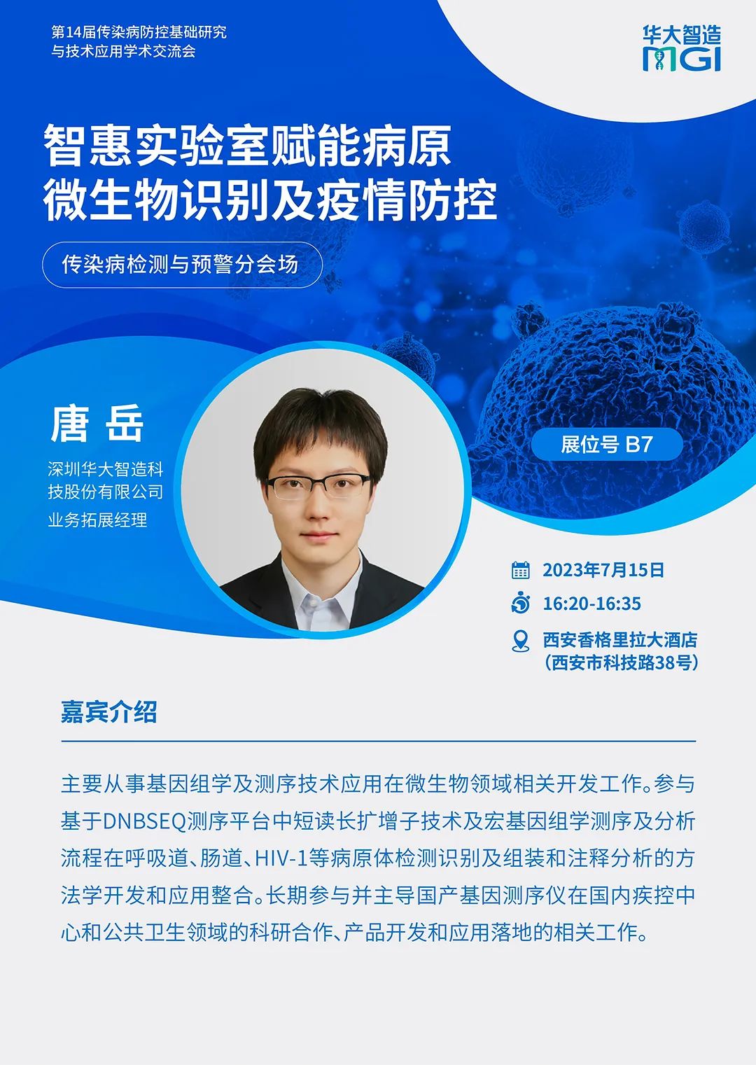 本次大会上,华大智造业务拓展经理唐岳,将在7月15日16:20-16:35于传染病监测与预警分会场分享“智惠实验室赋能病原微生物识别及疫情防控”报告,诚邀您的关注!
