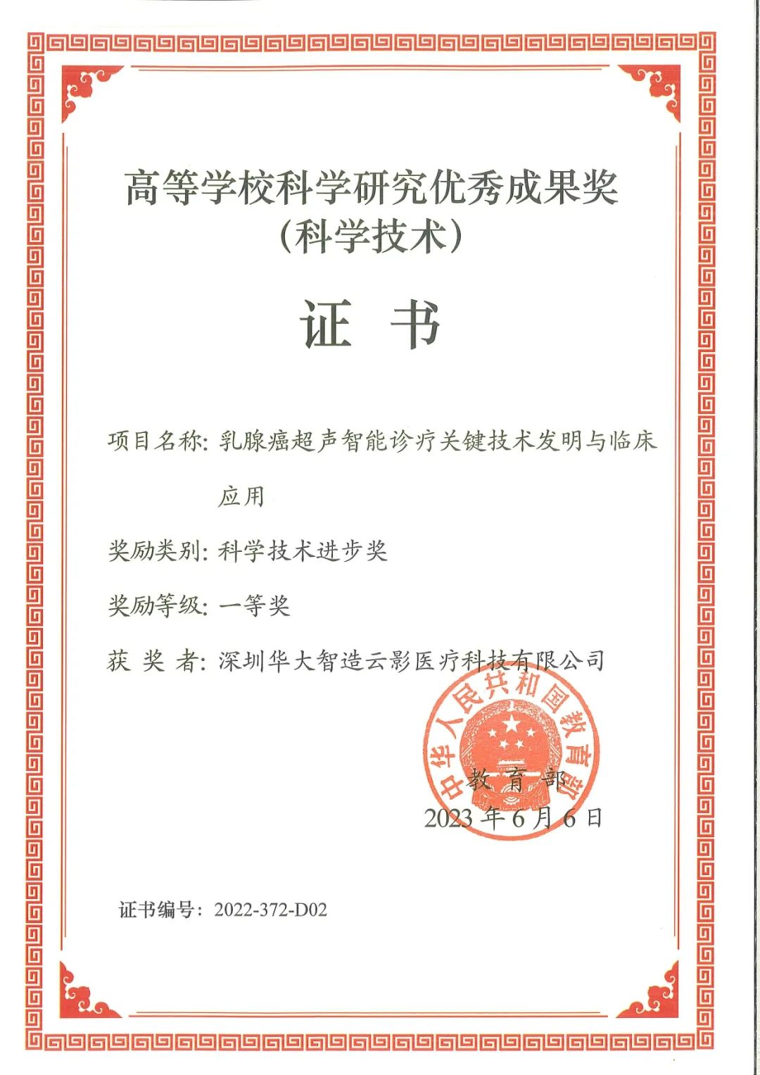 近日,教育部颁发了高等学校科学研究优秀成果奖(科学技术),由同济大学提名,华大智造云影等4家单位参与完成的《乳腺癌超声智能诊疗关键技术发明与临床应用》项目荣获科学技术进步奖一等奖。