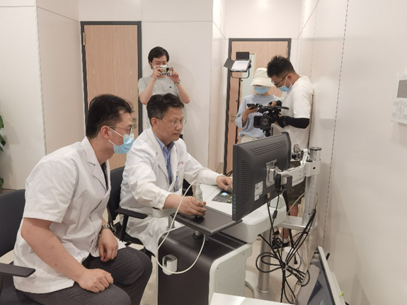 复旦大学附属中山医院徐辉雄教授使用远程超声机器人进行超声检查