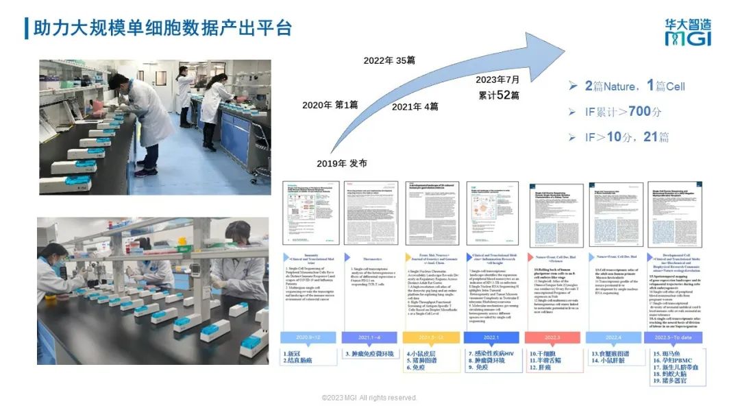 在单细胞产品领域,华大智造通过其率先发布的DNBelab C系列产品,已收获了众多企业及科研用户的好评。在过去的一年时间里,国内已有9个企业认证成为华大智造单细胞产品服务商,终端使用客户数量100多家。在科研产出上,基于华大智造单细胞测序平台,已累计产出高质量文章50多篇,其中包括2篇Nature,1篇Cell,其中有21篇文章IF>10,充分证明了该单细胞平台性能的优越性。