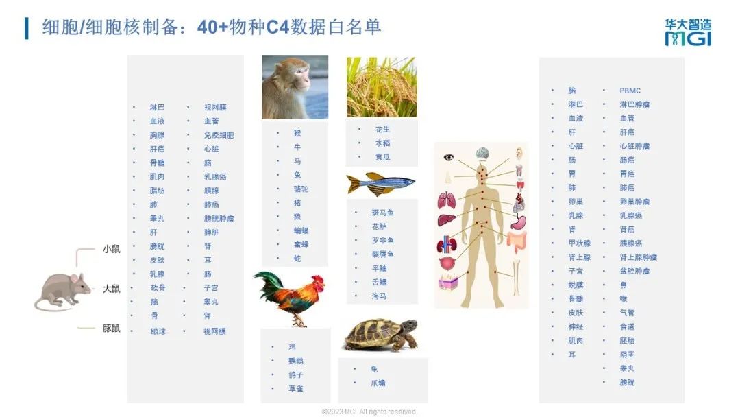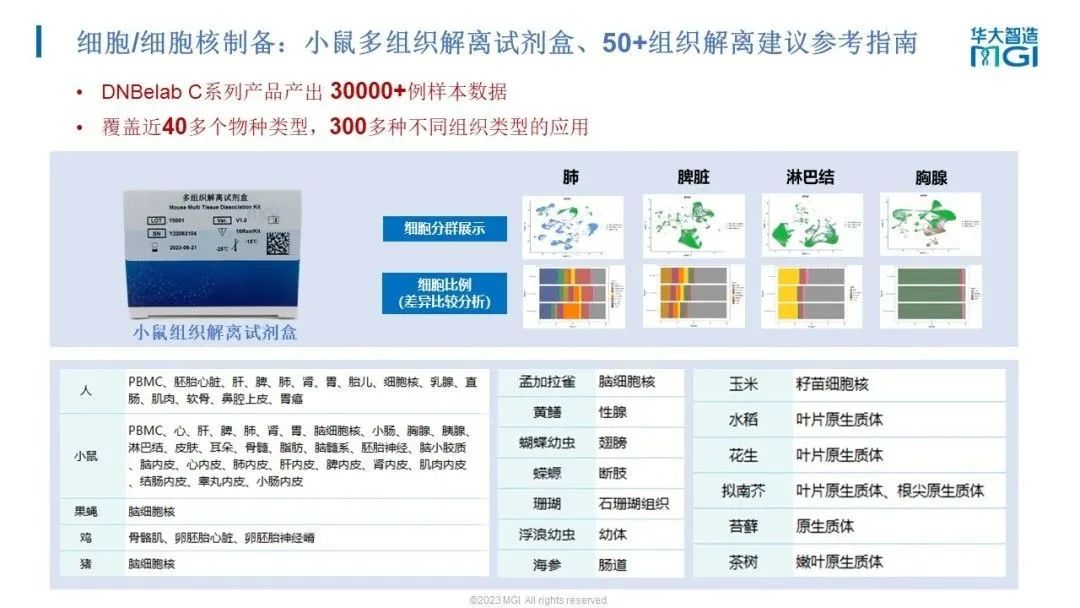 华大智造作为生命科技核心工具缔造者,能够为单细胞测序全流程提供独一无二的一站式平台。其中,针对细胞/细胞核制备环节,华大智造提供小鼠多组织解离试剂盒和50+物种组织解离方案指南;此外,已经发布的DNBelab C系列3’ RNA建库产品,已经产出了 30000+例样本数据,覆盖了40多种物种类型和300多种组织类型,重磅预告了不同物种组织的3’ RNA数据表现白名单,并展示了部分数据;在数据分析环节,提供配套的单细胞高通量、高精度多模态分析平台,不仅能够对单细胞测序数据进行简单的质控,还支持更多功能的分析和多组学数据的整合。