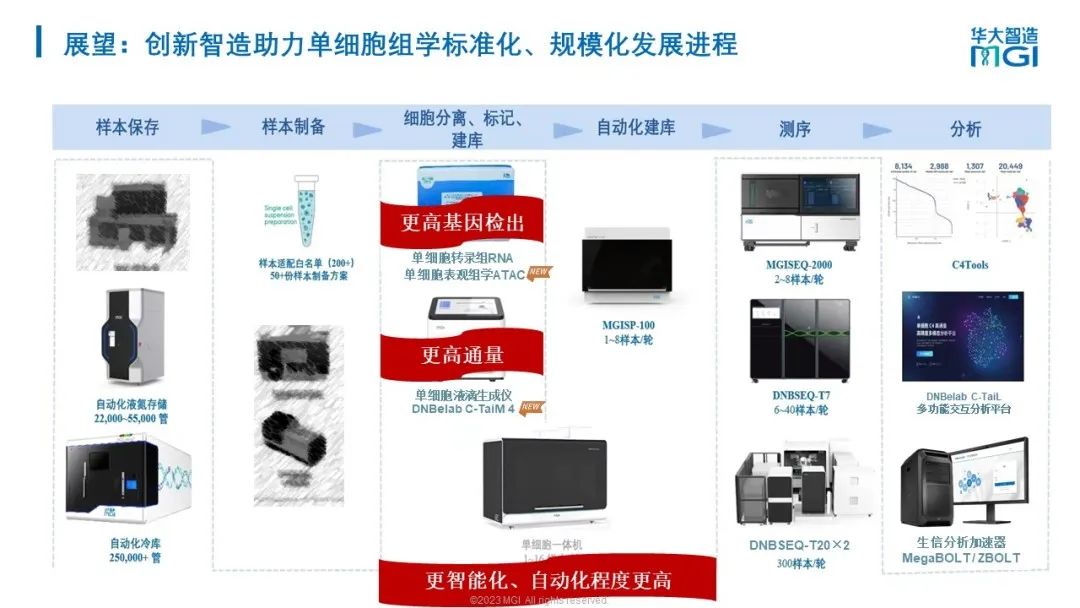 华大智造产品市场中心总监汪婧婧博士在发布会现场表示:“华大智造在单细胞领域,除了为科研人员提供单细胞建库产品和基因测序产品MGISEQ-2000、DNBSEQ-T7、DNBSEQ-T20外,还能够提供自动化文库制备系统MGISP-100,将复杂的单细胞文库制备过程转移到自动化平台一键运行,为单细胞行业引入了全新的自动化概念,这将开启单细胞湿实验标准化时代的到来,我们也坚信单细胞多组学标准化、规模化时代终将来临。”