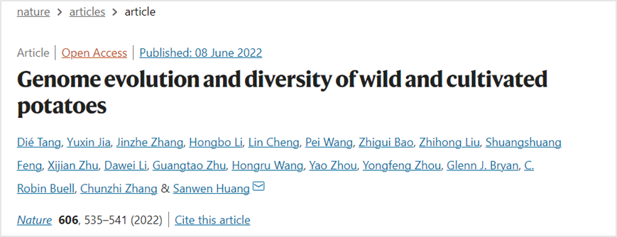 中国农科院基因组所黄三文团队在Nature杂志在线发表了“优薯计划”的研究成果,题为“Genome evolution and diversity of wild and cultivated potatoes”。研究人员挑选了有代表性的44份二倍体马铃薯种质进行基因组组装,用以探究马铃薯和近缘姊妹类群系统发生关系以及薯块的演化机制。其中,华大智造DNBSEQ-T7高通量基因测序仪承担了马铃薯根、茎、叶、块茎和花等组织中的总RNA测序工作。