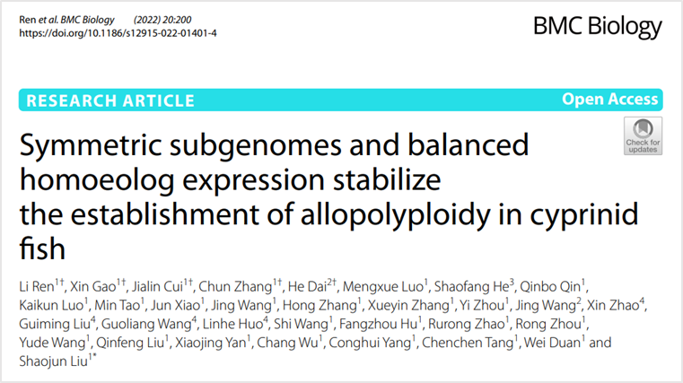 湖南师范大学生命科学学院刘少军院士团队在BMC Biology在线发表了题为“Symmetric subgenomes and balanced homoeolog expression stabilize the establishment of allopolyploidy in cyprinid fish”论文,该研究对异源四倍体鲫鲤F22代个体开展全基因组de novo测序、组装和注释后,对其与原始亲本红鲫和鲤开展了染色体共线性和比较基因组学分析,研究结果表明该个体基因组中包含红鲫和鲤的染色体组,同时发现红鲫和鲤来源的同源染色体间存在重组交换现象。