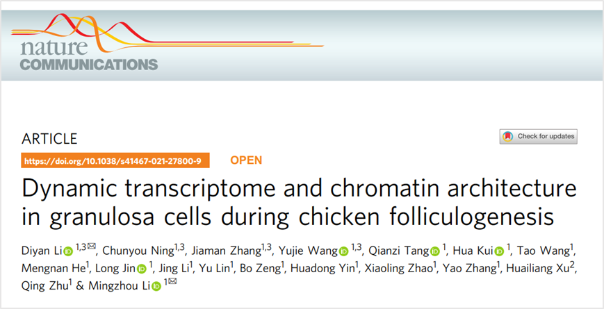 卵泡发生是一个复杂的生物学过程,涉及中央卵母细胞及其周围的体细胞。染色质三维结构是重要的转录调节因子,但其在鸡卵泡发育过程中对颗粒细胞转录调控的动态调控知之甚少。四川农业大学动物科技学院李地艳教授团队和李明洲教授团队联合在Nature Communications在线发表了题为“Dynamic transcriptome and chromatin architecture in granulosa cells during chicken folliculogenesis”的研究论文。