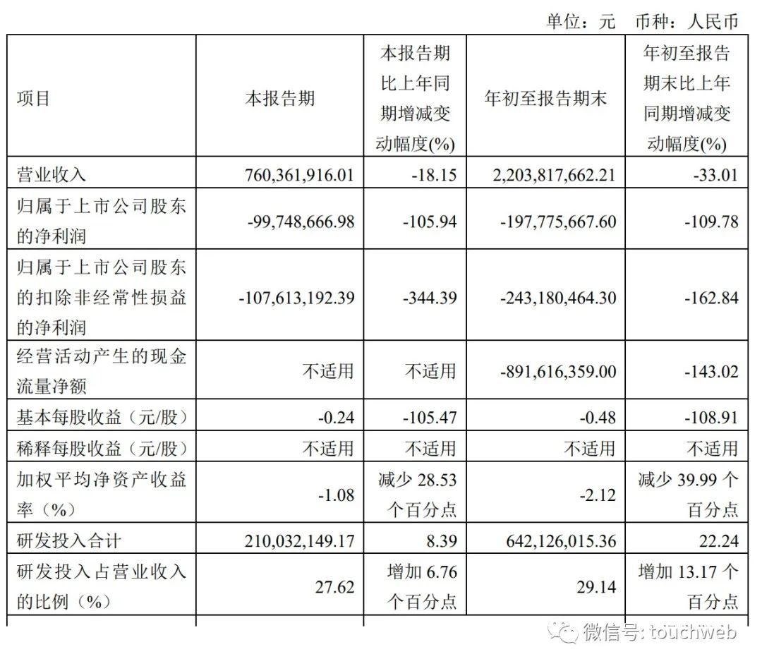 华大智造2023年第三季度营收为7.6亿元,同比下降18%;净亏损为9975万元;扣非后净亏损为1.08亿元。