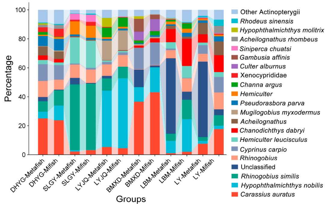 6个不同位点共检测到隶属于16个科、36个属的共51种鱼类,其中有较高比例的鲤科,鲴亚科,鰕虎鱼科和鳢科等。也检出了经济鱼类,如鲤鱼(Cyprinus carpio)、鲢鱼(Hypophthalmichthys molitrix)、鳙鱼(Hypophthalmichthys nobilis)、鲫鱼(Carassius auratus)等,还检出了入侵物种,如食蚊鱼(Gambusia affinis)。