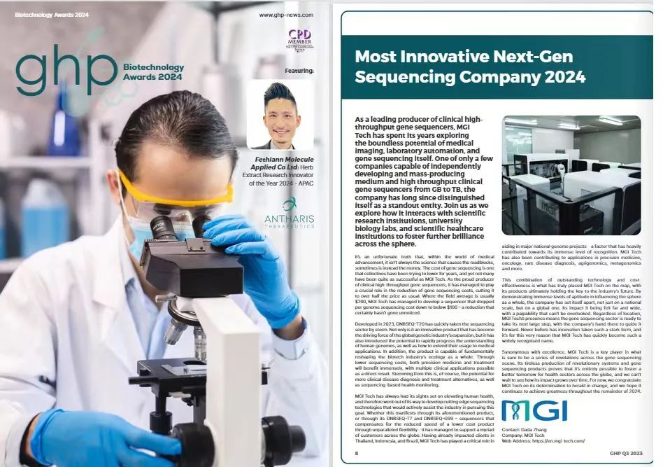 近日,英国全球健康与制药杂志Global Health Pharma Magazine(以下简称“GHP”)公布了2024 年度第9届Biotechnology Awards获奖名单,华大智造获得“最具创新力测序技术公司奖(Most Innovative Next-Gen Sequencing Company)”。