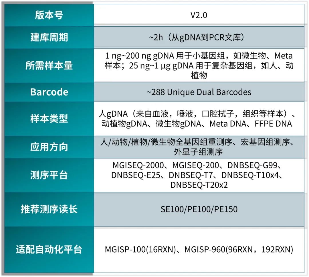 兼容1 ng~1 μg样本起始量,支持多种样本类型,包括血液、唾液、口腔拭子,FFPE以及低起始量的珍贵样本等,适用于多种物种WGS、微生物测序、宏基因组测序,以及WES;