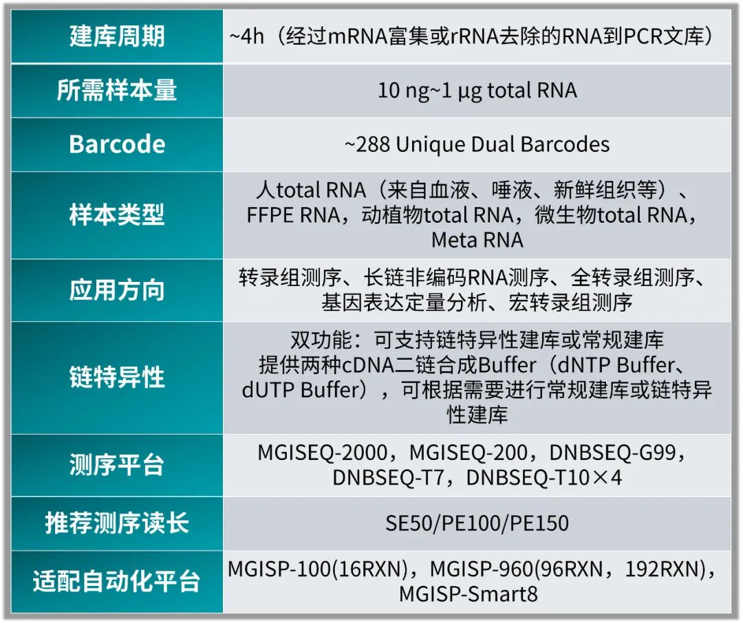 可搭配不同RNA富集方法及不同测序读长,适配两种DNB方式(常规环化、一步法DNB),满足不同建库需求。