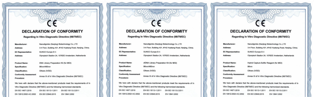 纳昂达依托在高通量测序领域深耕多年的经验,于 2018 年发布了华大智造平台靶向捕获测序全系列解决方案,并在 2019 年进行了全面升级,支持对血液、FFPE 组织和 cfDNA 等多种类型样本的低频突变分析。2021 年 7 月,纳昂达靶向捕获系列产品(华大智造平台)获得欧盟 CE 认证,这不仅是对纳昂达高品质产品的认可,更是对国产高通量测序技术实力的肯定!纳昂达以“技术先行者”的姿态,在国产替代的浪潮中抢占先机,为行业树立“中国方案”的科技新高度。