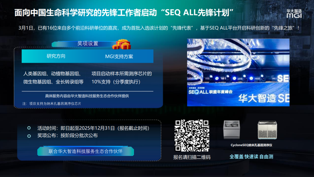 作为多组学研究的重要支撑,CycloneSEQ平台不断进行性能优化,持续助力应用场景拓展,通过长短读长测序结合,实现优势互补,进一步提升整体测序数据的准确性和完整性。为加速前沿技术普惠,近期华大智造面向中国生命科学研究的先锋工作者启动“SEQ ALL先锋计划”,旨在通过自主创新的工具,促进长短读长测序技术在科研领域的结合应用与成果转化。16位来自多个前沿科研单位的嘉宾,成为首批入选该计划的“先锋代表”,基于SEQ ALL平台开启科研创新的“先锋之旅”!