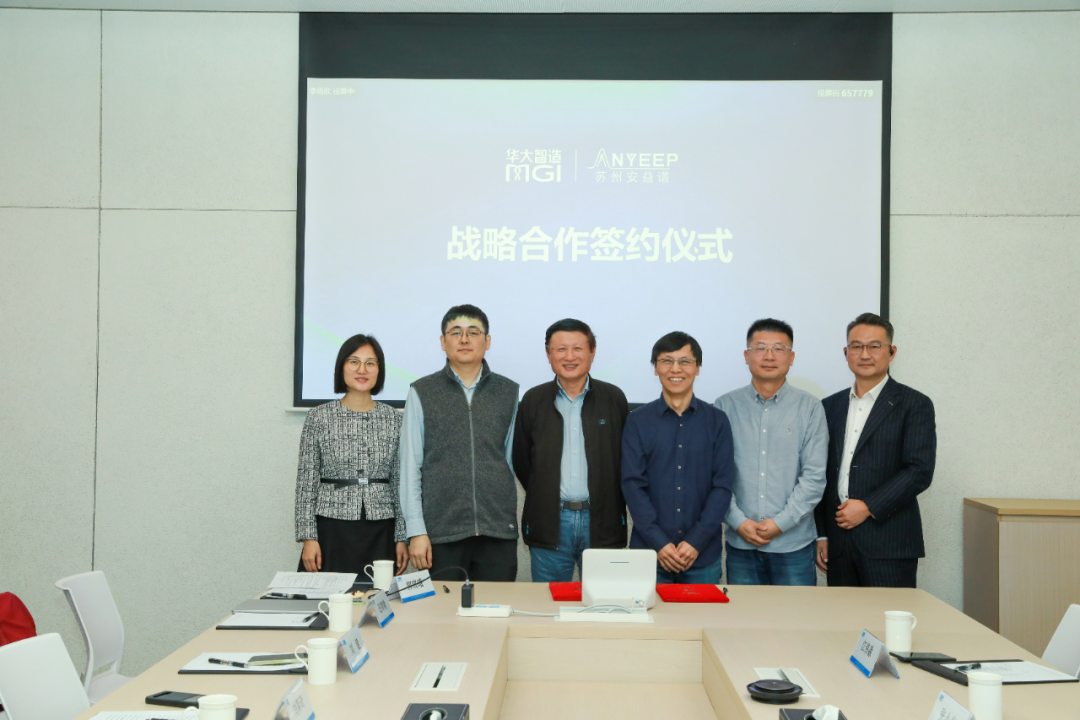 安益谱创始人、董事长张小华(右三),安益谱总经理江伟淼(右二),安益谱商务运营总监尚欣(右一),华大集团联合创始人刘斯奇(左三),华大智造执行副总裁刘健(左二),华大智造副总裁、中国区总经理彭欢欢(左一)出席签约仪式。