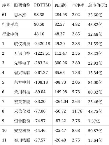 从行业市盈率排名来看,公司所处的仪器仪表行业市盈率平均90.50倍,行业中值48.16倍,思林杰排名第61位。