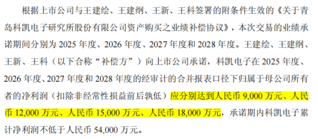 但王氏家族仍对科凯电子的未来充满信心,并做出了高额的业绩承诺:2025至2028年净利润分别不低于9000万、1.2亿、1.5亿和1.8亿,四年累计承诺总额达5.4亿。