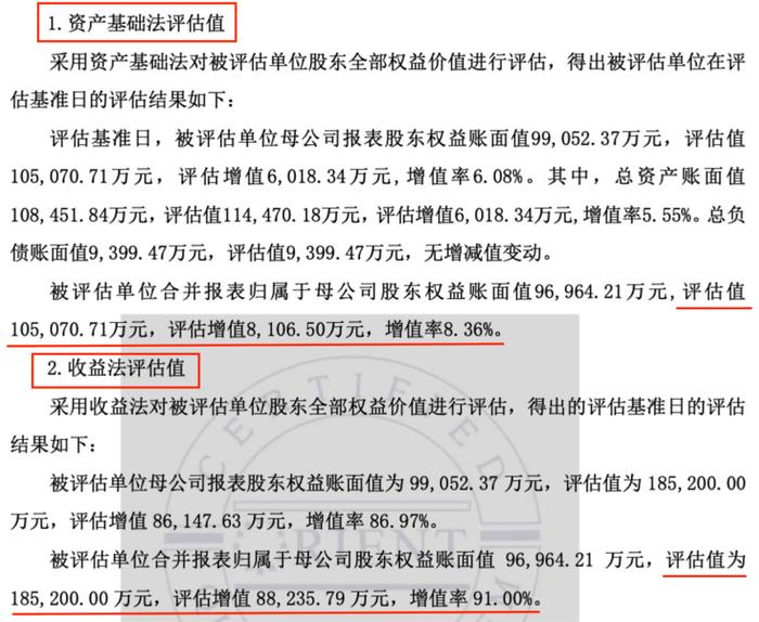 本次加期评估的评估基准日为2024年12月31日,采用收益法的评估结果与前次评估有所降低。本次评估值为18.52亿元,相较于前次评估结果21.02亿元下调了11.89%,评估增值率降至91%。