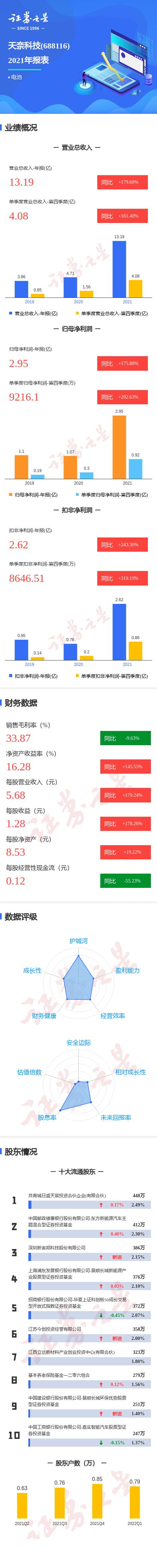 天奈科技2021年报显示,公司主营收入13.2亿元,同比上升179.68%;归母净利润2.96亿元,同比上升175.88%;扣非净利润2.62亿元,同比上升243.3%;其中2021年第四季度,公司单季度主营收入4.08亿元,同比上升161.4%;单季度归母净利润9216.1万元,同比上升202.63%;单季度扣非净利润8646.52万元,同比上升319.19%;负债率22.7%,投资收益2063.87万元,财务费用-417.52万元,毛利率33.87%。